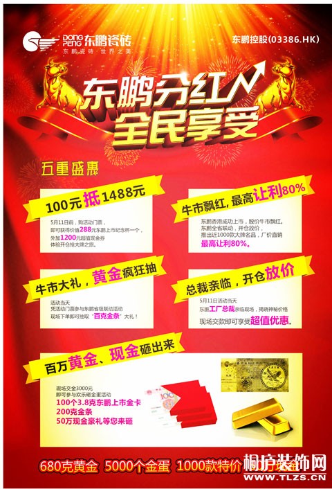 为祝贺东鹏股价节节飚升,活动现场推出百余款名品厂价直销,客户现场交订即可直接买工厂特供让利超低价产品,全场最高让利80%。
